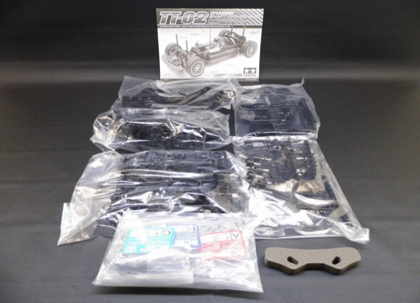 Tamiya TT02D ( DRIFT) kit in the bag including chassis, chassis parts (wishbones, wheel carriers, friction dampers), axles, shafts, gears, motor pinions, diamond holders, wheel wrenches, Tamiya Grease 3g tube, plastic bearing sets, assembly instructions